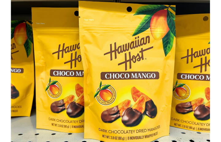 2025年に販売を開始したハワイアンホーストの最新商品「チョコマンゴー」。ハワイ通のお友達にあげると喜ばれます。中には個包装が8個入っているので、バラマキ土産にも最適。