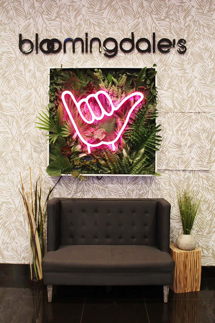 エヴァウィングに位置する高級デパート「ブルーミングデールズ」には、海側1階の入り口にネオンがまぶしいシャカサインと植物のセルフィ―スポットが。座り心地よさそうなソファもあり、待ち合わせ場所としても使えそうですね。