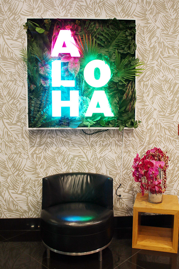 シャカサインの向かいには、こちらもネオンがまぶしい「ALOHA」の電飾があります。ぜひこちらでも1枚どうぞ。