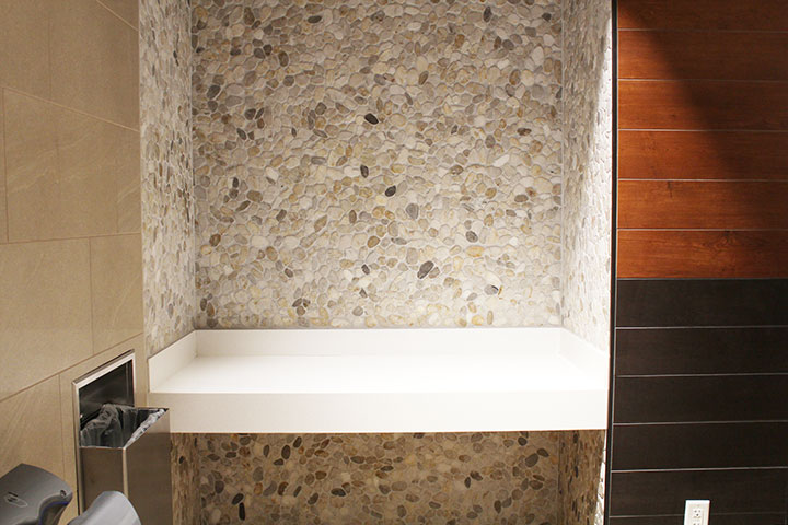 二ーマン・マーカスなど、デパートのトイレ(女子トイレしか見たことはありませんが)には、鏡の前に椅子が設置されているところもありますよ。