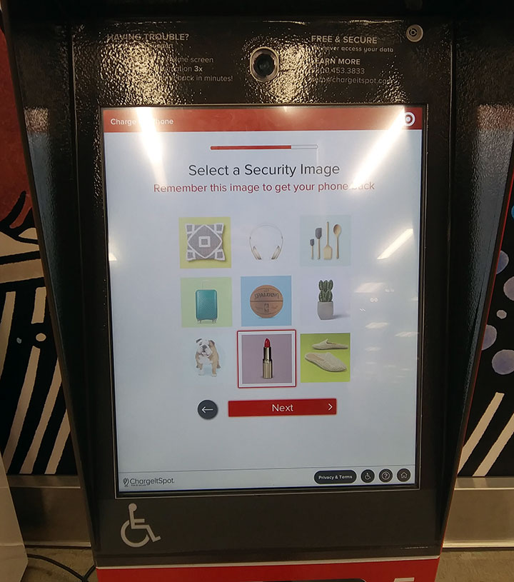 このように、ロックされた充電ボックスに電話を入れたまま、買い物や食事に行くことができるので安心。取り出したい時は、一番上の画面の「Pick Up My Phone(電話を受取る)」をタップして、自分が入力していた情報を再入力するとドアが開きます。