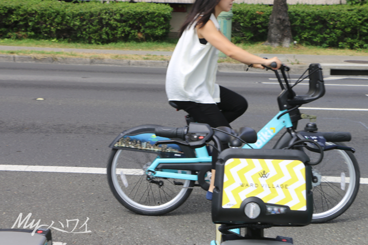 それでは、安全運転で出発。ワイキキやダウンタウンなどのビジネス地区では自転車で歩道を走るのは禁止されていますので、自転車専用レーンを走るようにしましょう。自転車専用レーンがない場合は基本的に、車道の一番右側を安全に注意して走ります。