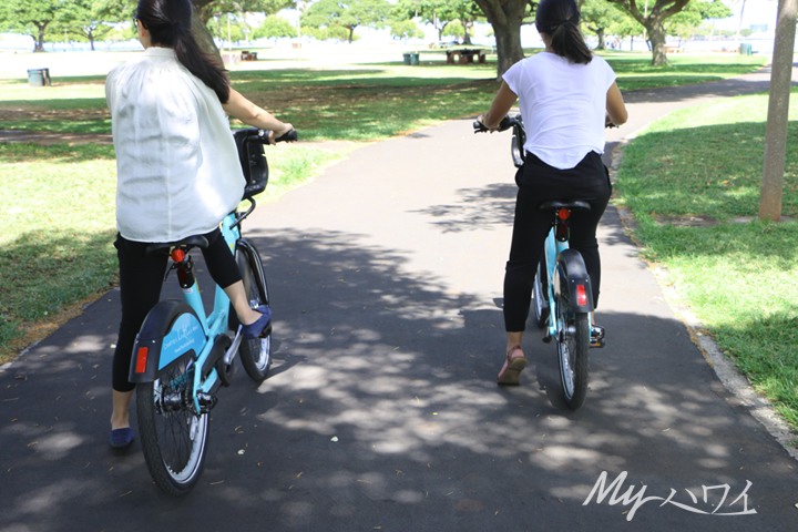 アラモアナビーチパークに到着! アラモアナビーチパークは広々として、サイクリングにぴったり。編集部員たちも海を見ながら自転車を漕ぎました。うーん、良い気持ちです♪ 散歩やジョギング中の人に注意して、自転車を走らせました。そろそろ30分かな? アラモアナビーチパークにはビキストップがたくさんあるので、その一つに返却します。