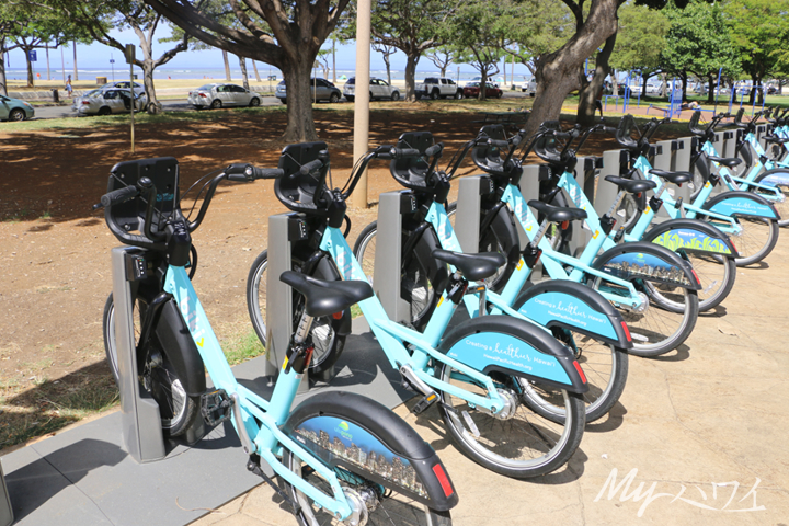 アラモアナビーチパークのビキストップは台数が豊富! 公園サイクリングに最適です。