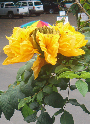 ALOHA! 今回のハワイ花図鑑は、日本では火焔木として良く知られるアフリカン・チューリップ・ツリーをご紹介します。通常濃いオレンジの炎のような花で有名なのですが、たまに写真のような黄色いものも見かけます。この花を見つけたのは、マノアの滝へ行く途中の道。ハッとするほど鮮やかな大振りの黄色の花に思わずシャッターを切りました。言われてみればいかにもアフリカンな色合いですよね。これは20mにもなる巨木で、山の中にところどころ花を咲かせた姿はまさに燃えるよう。迫力満点の大振りの花です。ボトッと落ちてきた花びらは、なるほどチューリップの形をしていましたよ。 |