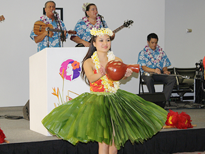 日本舞踊の披露の後は、ハワイアンのカフ(司祭)、ケオニ・ヌネス師によるブレッシング(ご祈祷)の儀式。ダンカリー社長とともに、マイレ・レイをほどき、いよいよ飛行機に乗り込みます。ハワイアン航空の社員が、ハワイらしさいっぱいのオーキッドのレイを人々の首にかけてくれ、ボルテージは最高に。