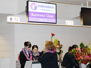 ●今度は羽田からハワイへ 19日(金)の午後11時59分。いよいよ、ハワイへの初フライトです。羽田空港のチェックイン・カウンターには長蛇の列が。新しい国際線ビルはどこもピカピカで、綺麗です。ハワイアン航空のカウンターにはハワイのお花がたくさん飾られ、ここでもハワイアン航空の職員の人々にオーキッドのレイをかけていただきました。レイっていいですよねー。 チェックイン・カウンター脇では、セレネーダーズがハワイアン音楽を演奏。ダンサー達が本場のフラを披露します。チェックインカウンターから、出国検査へ。出発ゲートへは、動く歩道を乗り継いで向かいます。動く歩道って、降りる時に注意しないとつんのめってしまいそう。注意、注意っと。 ●乗った瞬間ハワイのムード