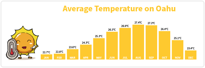 ハワイの気候は「常夏」「通年暑い」という印象が強いようですが、1年の中で気候や降雨量に多少の違いがあります。基本的には1年中太陽が見られ、昼間はTシャツ1枚でも過ごせます。
