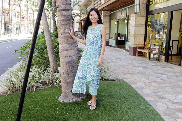 上のワンピース、トップス、パンツはワイキキ・ビーチ・ウォークにあるアパレルショップ、「ブルージンジャー」のものです。ハワイ滞在中のディナーやパーティー出席の際におすすめですよ。