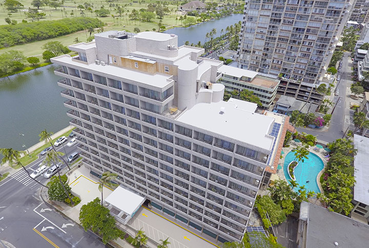 ワイキキ・サンドビラはアラワイ運河沿いにあるためオーシャンフロントではありませんが、ワイキキ・ビーチまでは徒歩5~6分程度の位置にあります。