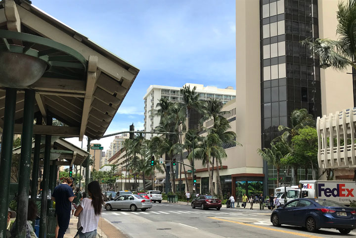 「ザ・バス(TheBus)」に乗ってアラモアナセンターに行く場合は、ホテルから海側に1ブロック歩いてクヒオ・アベニューに出れば、1ブロックごとにバス停があります。
