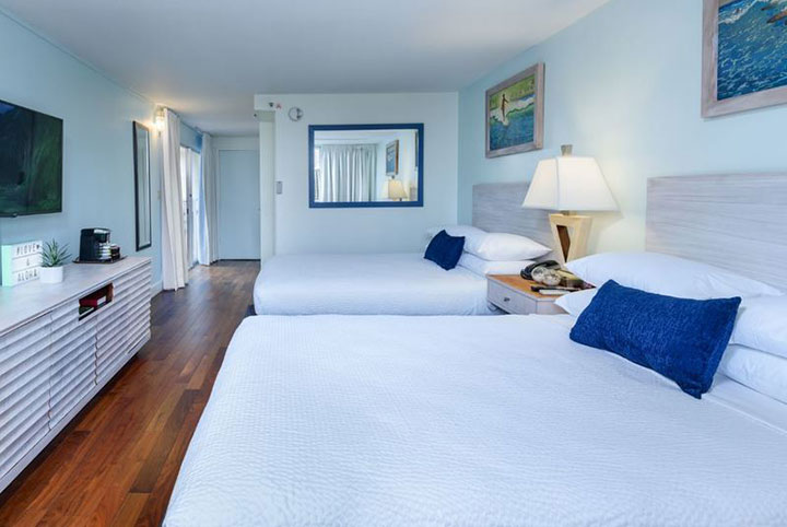 ベッドタイプにはキングサイズベッド1台、またはクイーンサイズベッド2台があります。こちらはクイーン2台のお部屋。客室面積は42平方メートル、最大宿泊人数はキング1台の部屋が2人、クイーン2台の部屋が4人です。