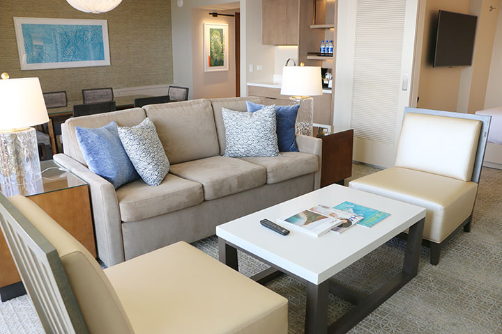 リビングルームはソファ、アームチェア、4人用ダイニングテーブル、収納式ベッド(ソファベッド)1台、映画チャンネル付きケーブルTV、ウェットバー、ミニバー、エアコン、セーフティーボックス、プライベート・ラナイを完備。ワイヤレスインターネット接続(Wi‐Fi)も用意されています。