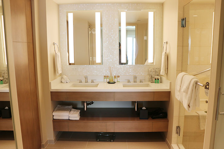 広いバスルームにはシンクが2つあるので、朝準備するときも楽々。バスアメニティはカウアイ島発の「マリエ・オーガニクス」の製品です。