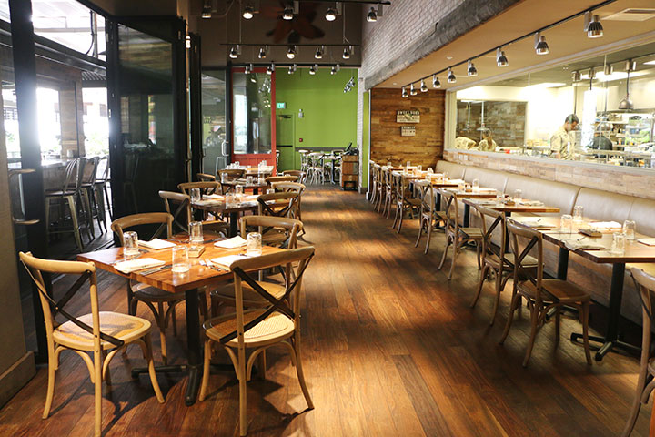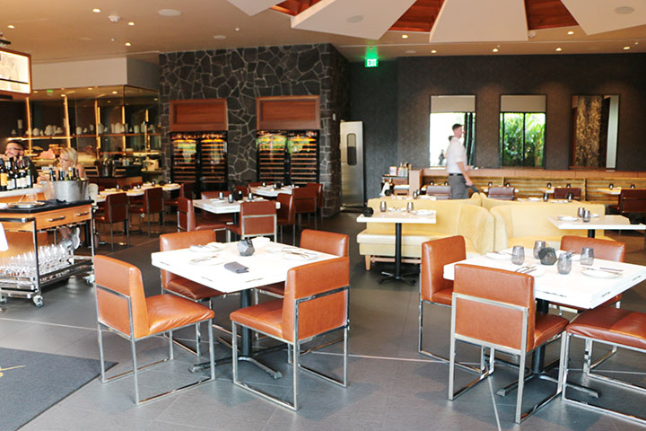 大きな窓から陽光が差し込むレストランのインテリアは、ビーチとサーフィンのテーマでまとめられていてモダンかつシンプル、そして爽やかな雰囲気。