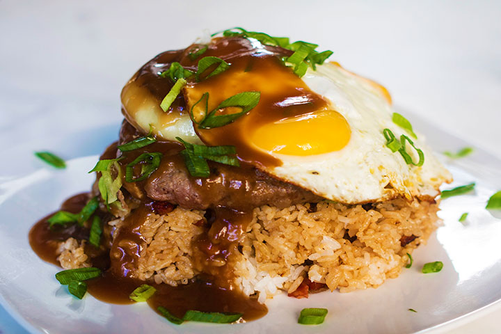 そして、こちらは朝から深夜まで1日中提供されているハワイ名物「ロコモコ」($18.55)。同店でも最も人気のあるメニューの1つです。高品質牛肉を使った大きなハンバーグパテとハワイアンスタイルのフライドライス(炒飯)にのせ、味わい深いグレービーをたっぷりかけて、目玉焼き2個をのせた豪華版です。ボリュームたっぷりなので、ほかの料理と共に何人かでシェアして食べるのもおすすめです。