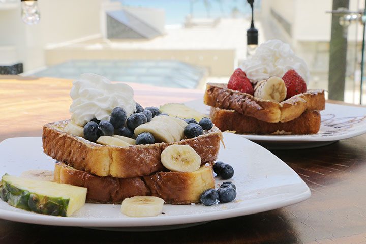 ショアファイヤーの朝食メニューは数多くありますが、中でもおすすめは2種類のフレンチトースト。「ハワイアン・フレンチトースト」(前、$14.25)はスイート・ハワイアン・ブレッドに地産のバナナとフレッシュなブルーベリーをトッピングしています。その上にパウダーシュガーとホイップクリームをプラス。
