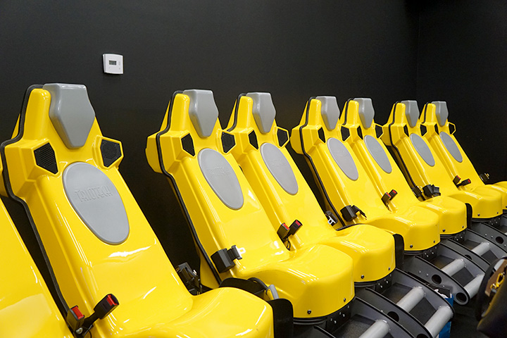 大型スクリーンの前に座って行うゲームで超リアルな7D体験を、大人から子どもまで(*5才から75才まで)楽しめます。