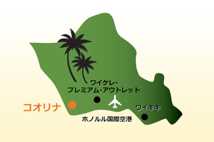 ホノルルから、カ・マカナ・アリイまではレンタカーで約40分(渋滞がない状態で)、アウラ二・ディズニー・リゾート&スパがあるコオリナ・リゾート(以下コオリナ)からは約15分で到着します。ワイケレ・プレミアム・アウトレットからも10分ほどで行けます。
