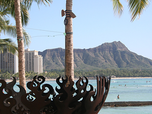 入り口のウミガメのオブジェこそ以前と変わらないものの、それ以外はすっかり模様替えしたシェラトン・ワイキキが私達を迎えてくれました。正直、以前のシェラトンは良いホテルではあったのですが、やはり老朽化は否めず何となく暗い印象で、団体向けのホテルのようなイメージがあったのですが、現在のシェラトンは木目を基調とした、すっかりモダンな大人の空間にロビーも廊下も、リニューアルされていました。そして毛利さんと海を望むレストラン、「カイ・マーケット」でモーニング・ビュッフェをいただきながらさっそく打ち合わせです。今回の改装で最も特筆すべきは、カイ・マーケットのすぐ近くにある「インフィニティ・プール」です。ビーチのない立地条件を逆手にとり、水辺すれすれまでプールを拡張してあるために、少し離れてみると、まるでプールから海まで一体のように見えます。このプールは16歳以上限定! だから静かなプールサイドでの日光浴は大人気で、早朝6時過ぎから欧米人の皆さんは張り切って早起きしていました。 |