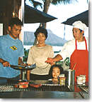 ハイアットには車を止めるのに、バレー・パーキングと自分で駐車場に出し入れする2種類ありました。バレー・パーキングは1日10ドルとその都度チップが必要になります。自分でだと1日6ドルということで、そちらの方にしました。そして主人は車を止めに駐車場へ、私達はスタッフの方と打ち合わせのため先にホテル内の「テラス・グリル」へ行きました。「テラス・グリル」はプールとジャグジーの横にあり、オープン・テラスの席からはワイキキ・ビーチが見えて、開放的で気持ちのいい雰囲気でした。 すでにそこに同じ時に当選された田内さん姉妹が到着されていました。私達舞い上がって、挨拶もお話もできませんでしたが、お二人のハワイはいかがでしたか? なんだか同じ当選したもの同士ということで、他人の気がしない私です… スタッフの方達とお話している内にどんどんハワイ気分が盛り上がってきました。が… 駐車場に行ったきりダンナが来ない。いくらなんでも遅いとYさんがホテル内を捜してくださいましたが、見つかりません。「もしかして、テラス・グリルの場所というより、テラス・グリルにいるってことすらわからなかったりして… 」なんて笑っていたら、そのとおりでした。私が側の吹き抜けの下を覗いてみたら、案内地図の前で焦ってるダンナが… 「車を止めるのに必死で、店の名前忘れてしまった」らしいです。おまたせしておきながらもいきなりビールを注文し、すっかりリゾート・モードのダンナなのでした。かましてくれますねー。