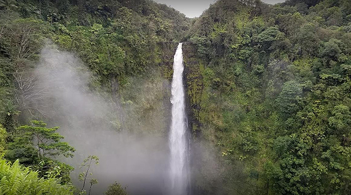 ハワイ島の東海岸にあるアカカフォール州立公園。前述のレインボーフォールから約30分のドライブのところにあります。小規模なレインボーフォールと比べると、アカカの滝は約135メートルの落差を誇り、緑豊かな壮大な滝の光景は圧巻です。駐車場から滝までは約800メートルのトレッキングコースになっており、落差30メートルのカフナフォールとアカカフォールの二つの滝を見学できます。