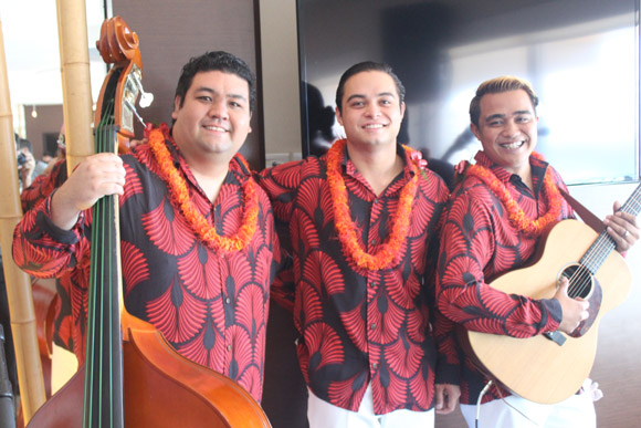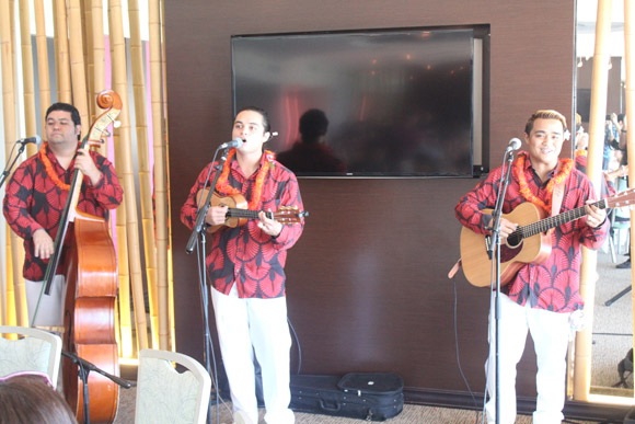 最初に登場したのは、様々な受賞歴を持つハワイで人気のトリオ、カイアオ。3人のコーラスが美しく混ざり合い、メレ・メイの幕開けにふさわしいハワイアン音楽を披露しました。
