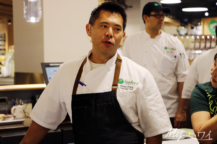 開店から1周年を迎えるにあたり、フードランドファームズには、たくさんの新メニューが登場します。イートインもますます充実し、ランチが楽しくなりそう。店内のポケ・ステーション、バーセクション、HI Steaks(ステーキ店)、グリルステーション、スイーツ売り場まで、美味しい新メニューが目白押し。今日は、1周年を前に、メディア向けの新メニュー試食会が行われ、編集部員も参加してきました。フードランド全体を監督するKeoni Changシェフ(写真)、Brian Nagaiシェフ、Rick Changペイストリー・シェフ(パティシエ)の3氏によるお料理の説明も行われ、参加者は豪華なメニューに舌鼓を打ちました。