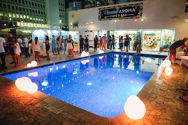 イベントではホテルのプールデッキに直結した「ハワイアン・アロマ・カフェ」が屋外アートギャラリーとなりました。またDJによる音楽が流れる中、水着のファッションショーも開催されて賑わいを見せていました。