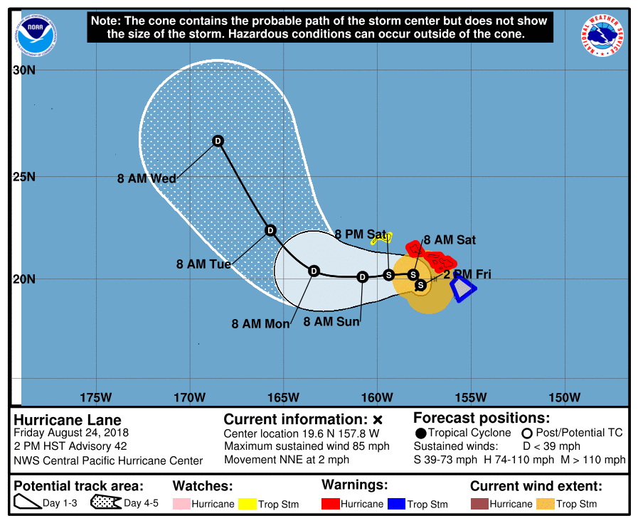 ハリケーン・レーンは現在、ハワイ島カイルア−コナの西南西170マイル、オアフ島ホノルルの南140マイルに位置し、最大風速105マイル、時速2マイルのゆっくりとしたスピードで進行しています。現時点での予報ではオアフ島には8月25日午後2時ごろにもっとも接近するものとみられています。