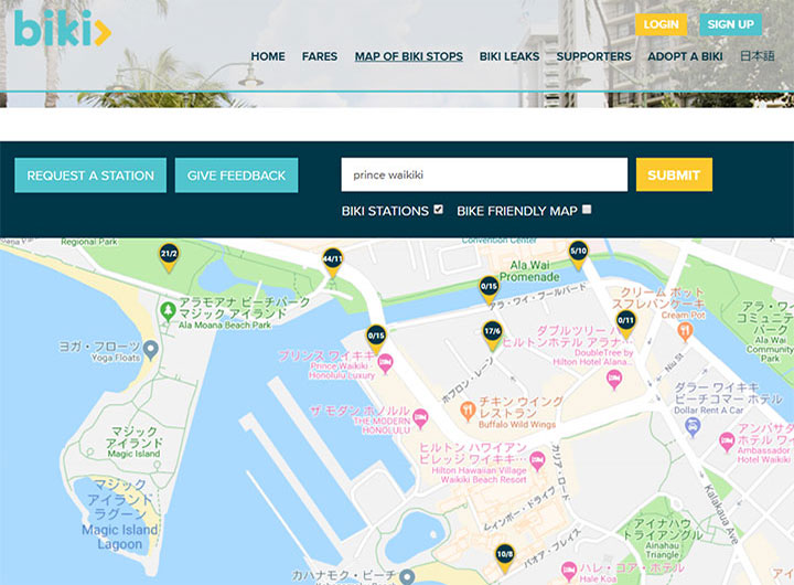 アラモアナセンター寄りにあるプリンス ワイキキは、ちょうどワイキキとワードビレッジがあるカカアコの中間に位置しており、徒歩だと20~30分。バスでも行けますが、ビキを利用すると待ち時間もなく行きたい時に行けて便利。ますます行動範囲が広がりそうですね。ビキの使用法や詳細については下記の記事を参考にしてください。