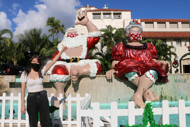 オアフ島ダウンタウン地区を美しく彩る「ホノルルシティライツ」の点灯式を12月4日(土)に控え、ホノルル市庁舎前に11月30日(火)、特大サイズのサンタクロース夫妻がお目見えしました。