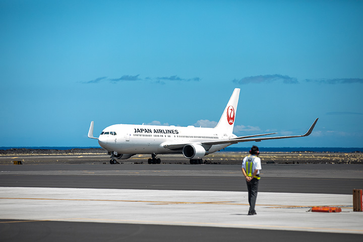 日本航空はこのほど、成田-ハワイ島コナ線の直行便の運航を再開。ハワイ時間8月2日 (火) 午前11時に、乗客177人を乗せた旅客機がケアホレ地区のエリソン・オニヅカ・コナ国際空港に到着しました。