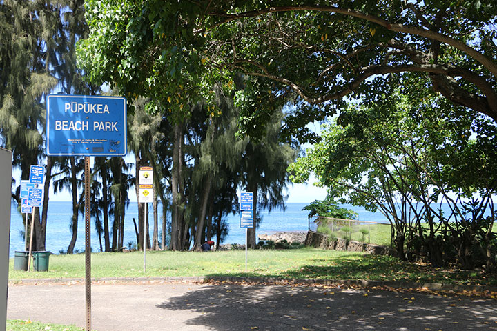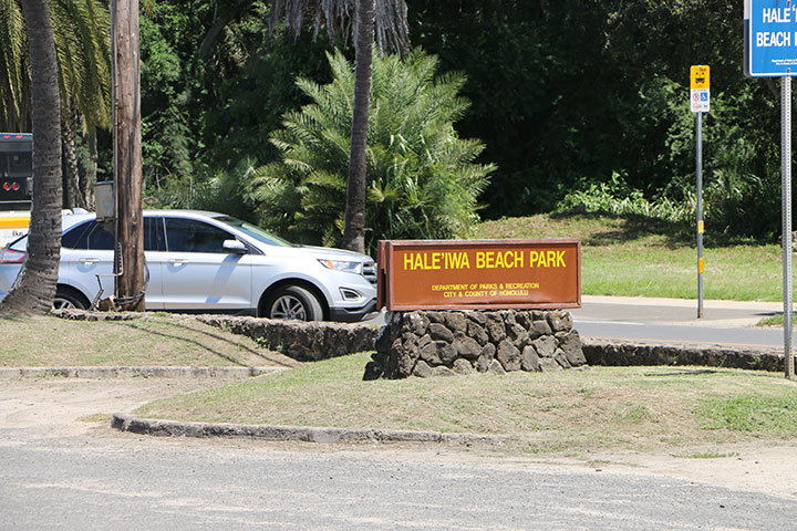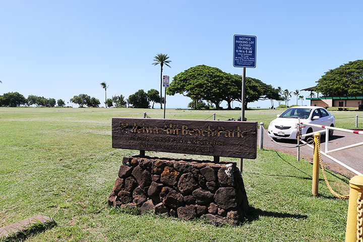 カメハメハ・ハイウェイを北上していくと、左側に大きなサインが見えてきます。ただ駐車場が狭く、朝9時以降は満杯になることが多いため、このビーチパークを訪れたい場合は早朝到着するのがおすすめ。午後になるとまず確実に駐車スペースがありません。
