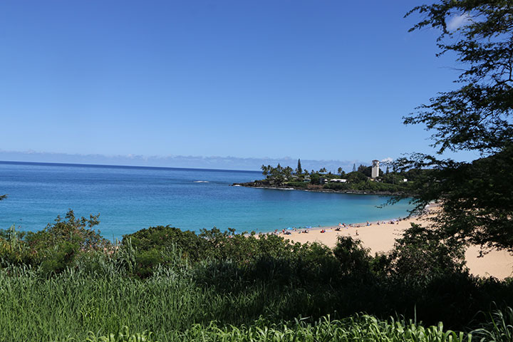 湾を見下ろす道路からは、このような美しい景色が望めます。冬はビッグウェーブコンテストが行われるほど沖の波が高くなりますが、今の季節はまだこの通り湖のような静けさ。波がなく水が澄んでいるときはシュノーケリングも楽しめますよ。