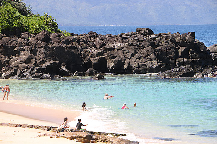 ププケア・ビーチパークのすぐ先にあるのが、シュノーケリングスポットとして有名なシャークス・コーブとその左にある浅瀬のラグーンです。下のように、ラグーンはビーチ部分を岩が囲むような構造になっています。