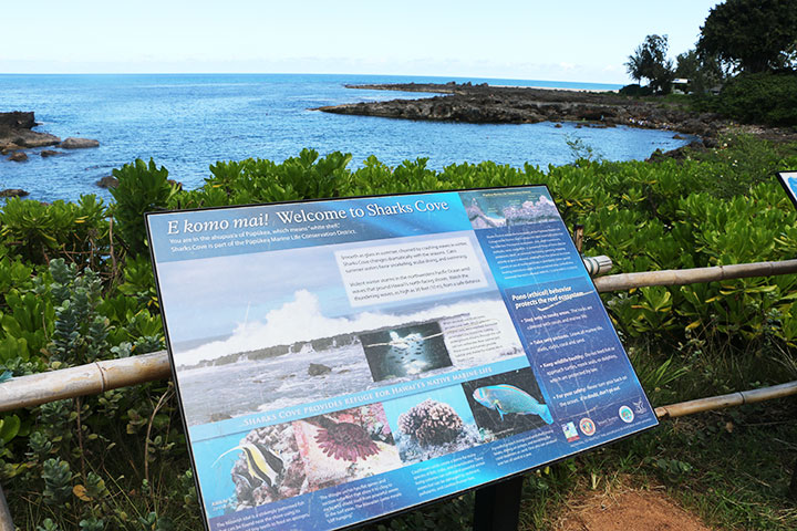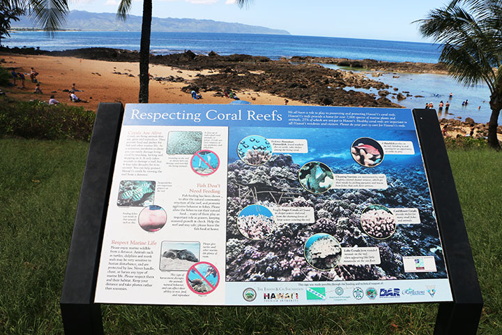 ここには下のような珊瑚礁に関する展示の看板が複数あります。これを読むとハワイの珊瑚礁に関する基礎知識を得られますので、安全対策も兼ねて、シュノーケリングを楽しむ前にまず読んでみてくださいね。