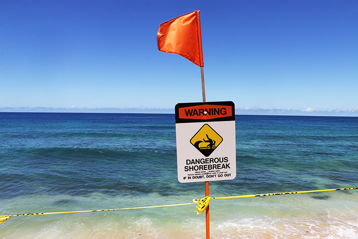 高波やジェリーフィッシュ(くらげ)警報などの標識がある時は海に入らないでください。