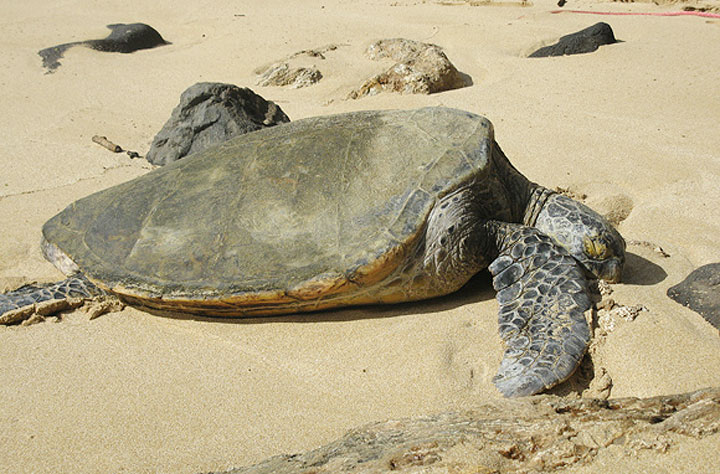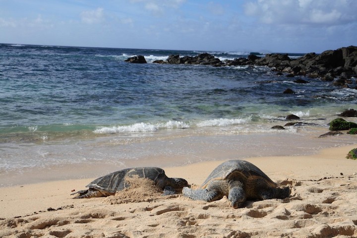 カメと写真を撮りたい、とこのビーチを訪れる人々が多いようですが、カメの3メートル以内に近づいたり、触ったりすることはハワイ州法と米連邦法で禁じられており、違反すると罰金刑に処せられますのでご注意ください(ビーチには野生動物の見張りをする担当の人がいます)。また、カメにエサをやるのも禁止されています。