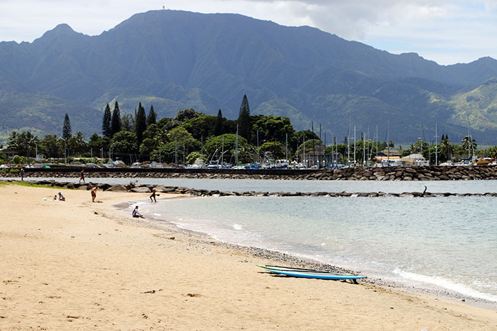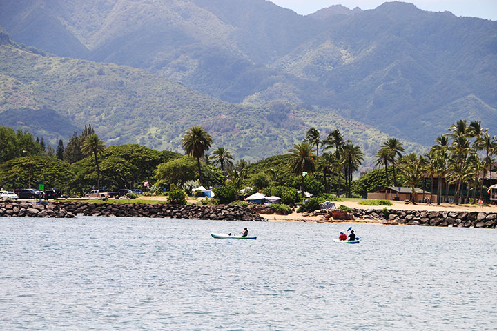 ノースショアとオアフ島西部を隔てるワイアナエ山脈をバックドロップにする風光明媚な景観で、写真も絵になりますね。後方にはハレイワ・ボートハーバーが見えます。