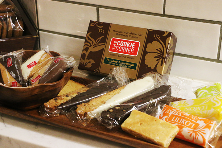 トロピカルフルーツバー$11.75~、ハワイアンマカデミアナッツショートブレッド箱入り$11.25~、ビスコッティ$12.50(詰め合わせの価格です)