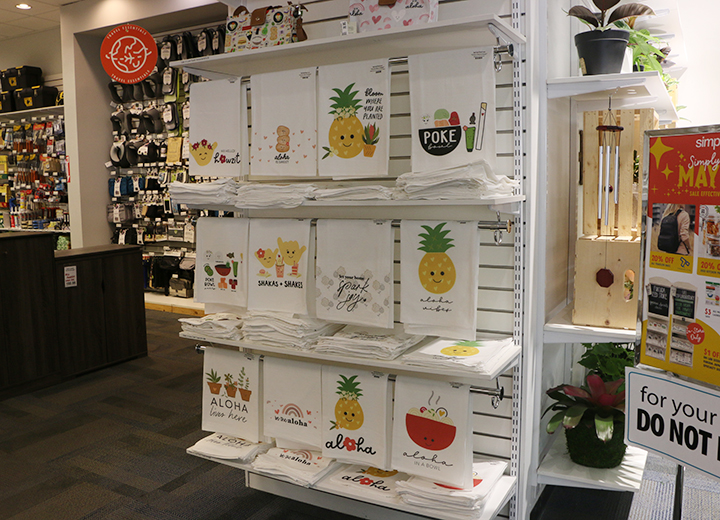 今年オープンしたばかりの最新インテリアショップは、家具などの他に日用品も充実しています。特に、可愛いハワイアン・キャラクターのキッチンタオルなど、キッチングッズが豊富です。
