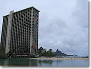 | ■曇りの日でも工夫次第で楽園写真が撮れる! 「常夏の楽園ハワイ」というくらいで、ハワイは一年中まぶしい太陽が照りつける場所であることに間違いはないのですが、天気の悪い日だって当然あるわけです。特に北半球が冬の季節はハワイにとっても冬なので、気温の低い日や雨の日も多くなります。まれに日本の梅雨のように一日中雨、または曇天という天気が2、3日続くこともあり、たまたまそんな時にハワイ旅行の日程が重なってしまうこともあるでしょう。天気の悪い日にはデジカメを取り出す回数も少なくなりがちですが、ちょっと工夫すればハワイらしさを演出した写真を撮ることだってできるのです。 曇っている日に写した写真は実際の印象よりも暗くなってしまうことが多いですよね。特に空や海を大きく写しこんだ構図では特に暗くなりがちです(作例1)。それはカメラが、構図の中の広い空の部分の明るさを平均的な明るさ(白と黒の中間、つまりグレー)と判断するからですが、特に曇っている場合は建物や木に光が当たっていないので、その部分が余計に暗くなってしまうのです。これを避けるためにはデジカメの撮影メニューから露出補正(たいていの場合、[+/-]のように表示されています)を選んでプラス側に「0.7」とか「1.0」程度調整すると、見た目に近い明るさで写せます。あるいはPCに取り込んでからデジカメに付属の画像ソフトなどで明るさの調整をするとかなりいい感じになります(作例2) 。