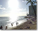 ■「半押し」テクニックを上手に使って撮影 注意するポイントを押さえたらあとはビーチと撮影を存分に楽しみましょう。青い海に映えるカラフルな「カタマラン&ダイヤモンドヘッド」といったワイキキビーチの定番ショットや眩しくきらめく海の表情をズームで狙ったり… と被写体には事欠かないはずです。波打ち際で打ち寄せる波を撮るときには前回の講座(「動くものを撮ってみよう」)で出てきたシャッターボタンの半押しでピントを合わせてシャッターチャンスのタイミングを狙うテクニックが役に立つはずです。 |