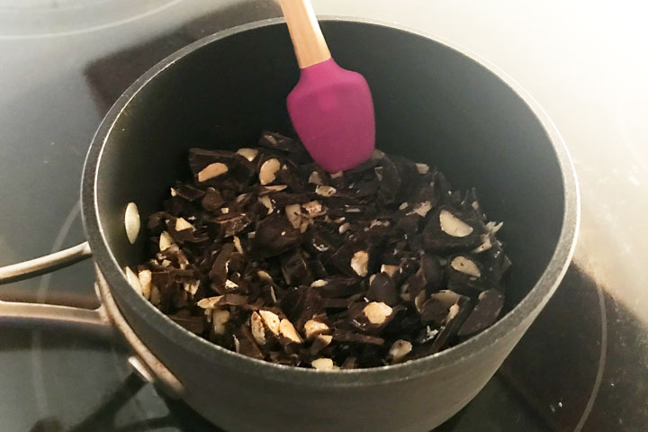 耐熱ボウルがある場合は、そこに刻んだチョコレートを入れて、電子レンジで軽く温めて溶かすほうが簡単です!