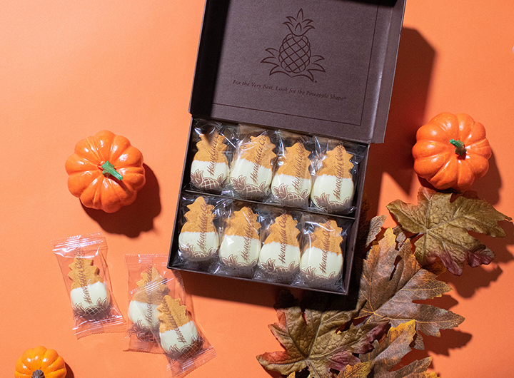 同ブランドの秋の定番でもあるホワイト・チョコレート・パンプキンは、パイナップルの形をしたサクサクのプレミアム・ショートブレッド・クッ キーをホワイト・チョコレートに一つずつ丁寧にディップしたもので、クリーミーな甘さが特徴です。