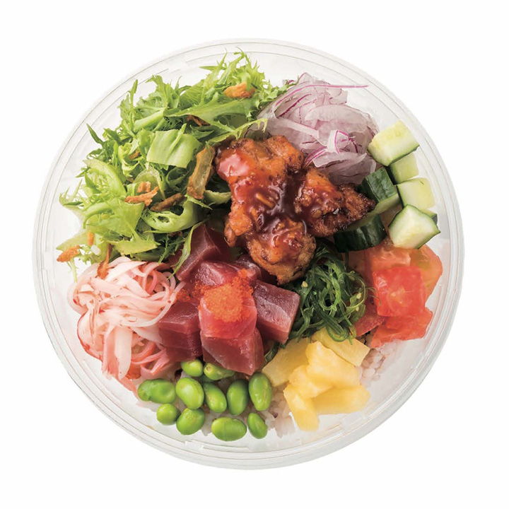 アヒポケ、サーモンポケ、ローカルに人気のもちこチキンの3種類の組み合わせから選べ、レタス、枝豆、トマト、カニかま、オーシャンサラダ、パイナップルなど10種類以上の野菜や果物をトッピングします。ポケやもちこチキンと野菜をご飯と一緒に海苔で巻いた具沢山のポケブリトーもあります。
