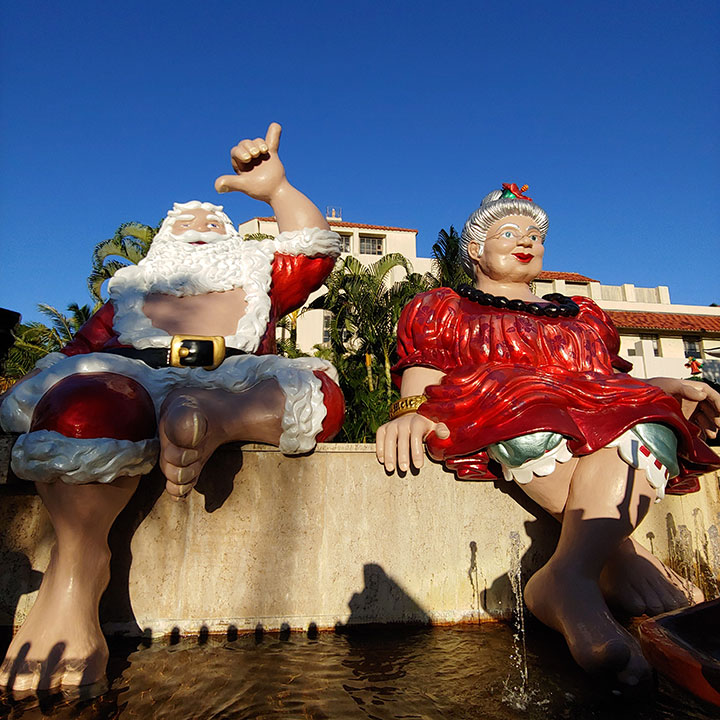 毎年ホリデーシーズンに登場する一番の人気者、シャカ・サンタとムームー着用のミセス・クロース(またはトゥトゥ=ハワイ語でおばあちゃんという意味)。ハワイならではのカジュアルな装いで、ホノルル・シティライツのマスコットとして見学者を笑顔にしてくれます。キングストリート沿いにあるのでトロリーからも見学できますが、チャンスがあればぜひ市庁舎に会いにいくことをおすすめします!