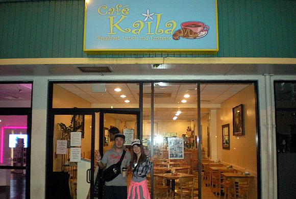 さて、ホテルを出て薄暗い中車を走らせぴったり6時半、カパフルにあるカフェ・カイラに到着です。誰も並んでいません、「並ぶなら一番!!」という主人の意気込み通り、一番に並ぶことができました。すると、やっぱり人気なのですね、すぐに何人もの日本人観光客が並んでいました。 カフェ・カイラはハワイの本には全てと言っていいほど載っている、フルーツがもりもりとのったパンケーキが有名なお店です。オーナーのカイラさんは女性ですし、かわいらしいお店なので女性の店員さんが多いのかな~と思いきや、出勤してくる店員さんは男性ばかり。ちょっと不思議な光景に見えました。