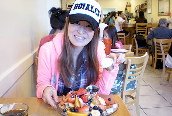 7時に開店し、店内へ通されました。ふたりして第一声に、寒い!(笑) 今までの経験から予想はしていましたが、早朝でしたからこんなにも冷房が利いているとは思いませんでした。席に座り、日本語メニューを受け取り、私たちはフルーツ全部のせのパンケーキとフレンチトーストとコーヒーをお願いしました。テーブルに運ばれてくると、「すごーい!!」の連続でした。こんなにも沢山、これでもかとフルーツがのっているなんて!!日本でトッピングをしたとしてもこんなにのっているものはないと思います。なので、より驚きました。フレンチトーストもふわふわでボリューミー♪ それぞれにお好みに合わせて生クリームとシロップとバターが付いていました。甘さ控えめのパンケーキも食べやすいのですが、フルーツも量が多いので、二人で食べてもなかなか減りません。でも、美味しく頂きました♪ ちなみに、男性の店員さんですが、とても気さくで「味はどう?」などと聞きにきてくれたり、とても笑顔が素敵でフレンドリーな方達ばかりでしたよ。